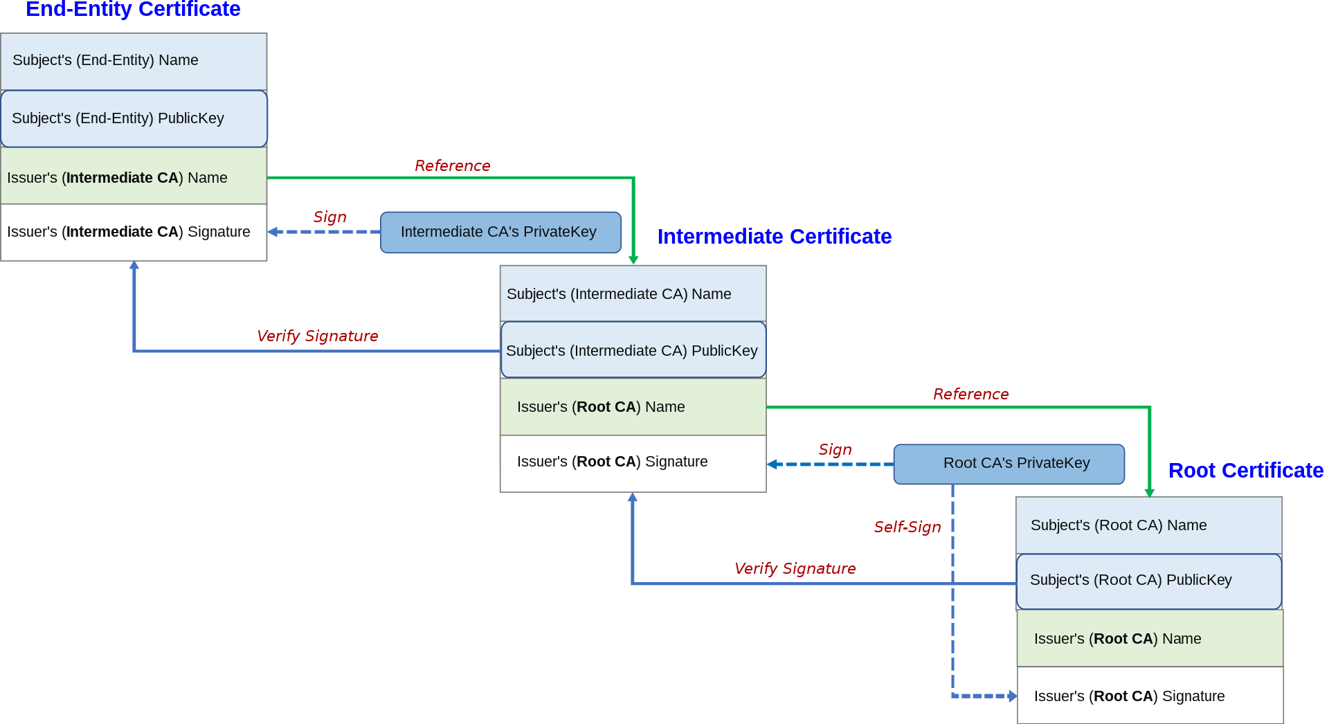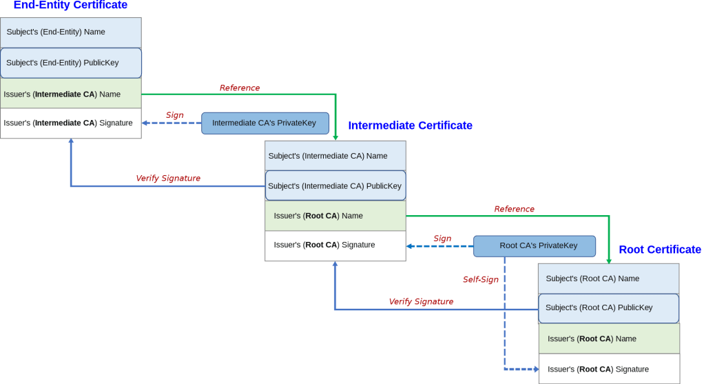 Root CA’s signature is then attached on Intermediate CA’s certificate, along with Intermediate CA’s public key. Intermediate CA generates its own signature using its public and private keys.