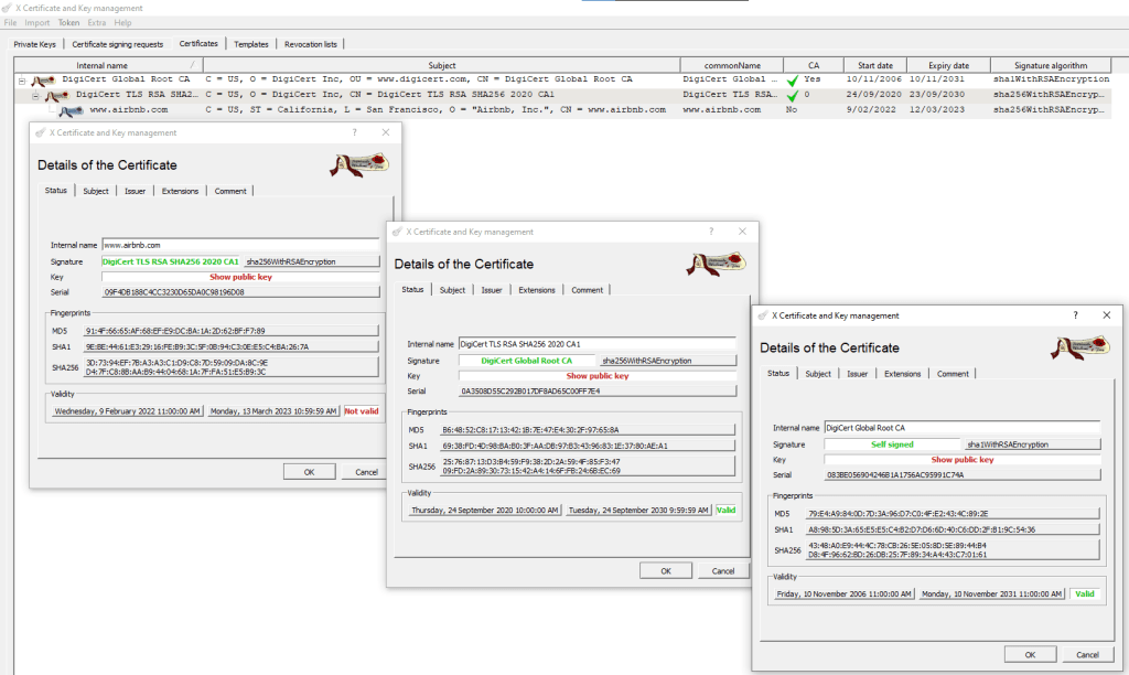 Inspecting a certificate will show that the certificate was most likely issued by an intermediate “Issuing Authority”. Below screenshot was taken by importing certificate of www.airbnb.com and all certificates in its chain of trust.