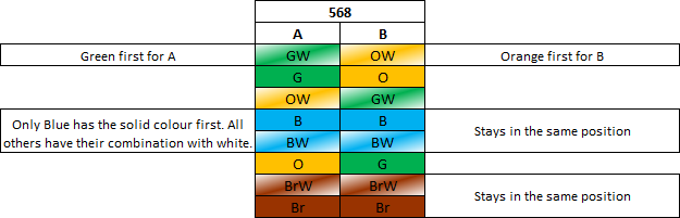 568A and then 568B use “GO Blue”. Green is the first for A. Orange is the first for B. Blue comes first and is the only colour to have solid first followed by its white combination.