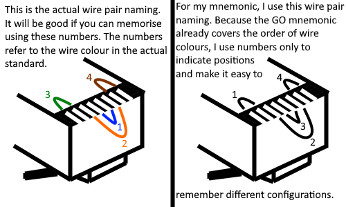 There’s a standardised wire pair naming as a result of this history. Pair 1 is the innermost, pair 2 is around pair 1. Pairs 3 and 4 are on either side of 2. Pair 3 is to the left of 2. Pair 4 is to the right of 2.