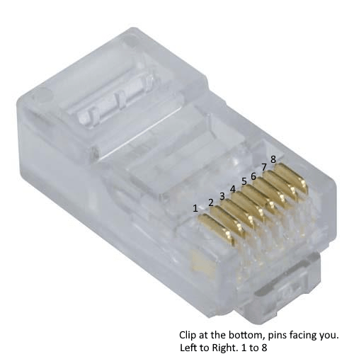 It’s just surprising how many people get this wrong. Part of the confusion with wrong numbering is in using just a silhouette/outline of the 8p8c(8 positions, 8 contacts) connector in diagrams. Ethernet cabling has codified the wiring schema as RJ45S. Coloquially we call it the RJ45 connector. Whatever floats the boat. I suggest visualising the 8p8c connector with the safety clip at the bottom and facing the pins. This makes it easy to remember the pin numbers ascending from left to right (same direction as we write Inglish).